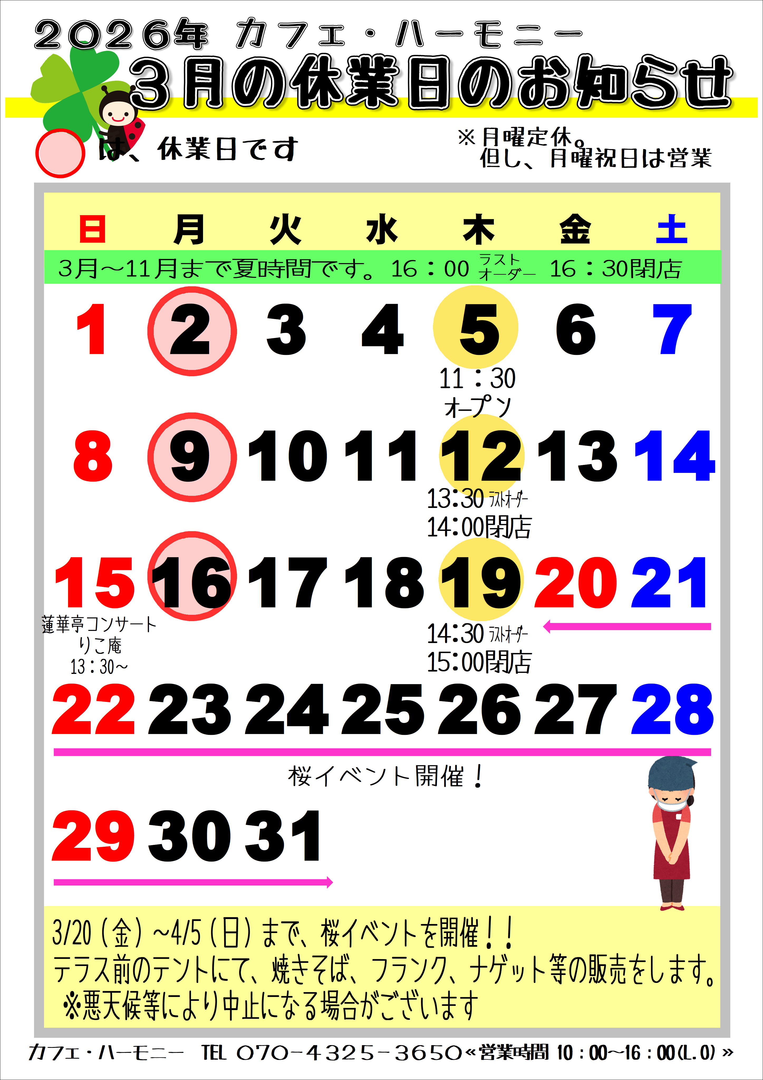 2026年3月の営業日/休業日カレンダーを掲載いたします。